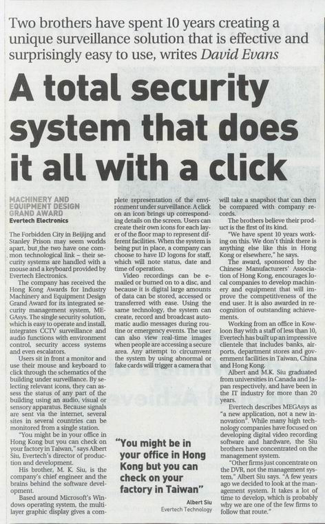 MEGAsys Security Management System has won the competition of 2003 Hong Kong Award for Industry: Machinery and Equipment Design Grand Award. The Award Presentation Ceremony to be held on Monday, October 27 at the Hong Kong Convention and Exhibition Centre.